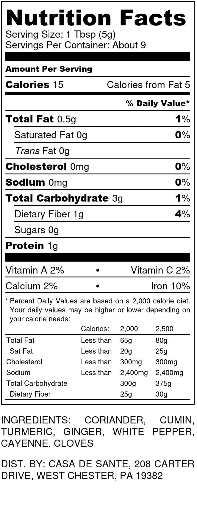Ingredients: Turmeric, Coriander, Cumin, Ginger, White Pepper, Cayenne Pepper, Clove.